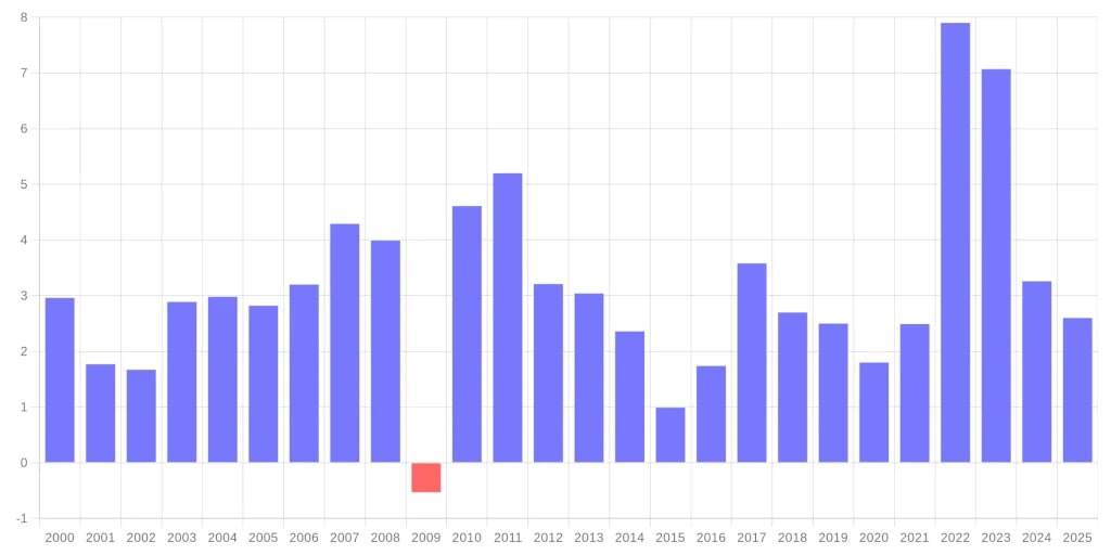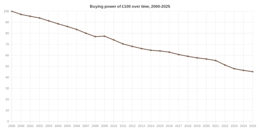At the turn of the millenium, £100 would've purchased the equivalent purchasing power as £215.11, at the time of writing. Essentially, that is an increase of £115.11. This primarily due to the fact that the pound has had an average inflation rate of 3.11% per year between 2000 and 2025, which has produced a cumulative price increase of 115.11%